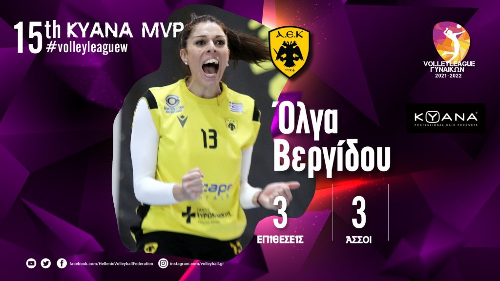 Η Όλγα Βεργίδου αναδείχθηκε KYANA MVP της 15ης αγωνιστικής του Πρωταθλήματος της Volley League Γυναικών. Η διεθνής πασαδόρος της ΑΕΚ ήταν η κορυφαία στην μεγάλη εκτός έδρας νίκη της Ένωσης στην έδρα του ΠΑΟΚ με 3-1 σετ.