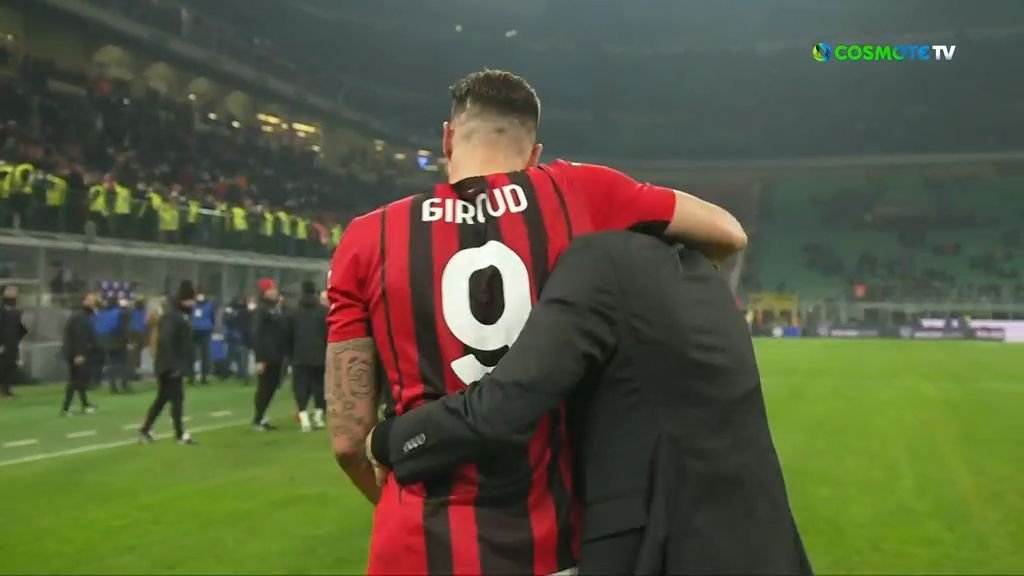 Παίκτες και προπονητικό επιτελείο της Μίλαν έσπευσαν να αγκαλιάσουν τον Γάλλο φορ, που, με δυο δικά του γκολ, οδήγησε την ομάδα στην ανατροπή και στη νίκη στο ντέρμπι του Μιλάνου