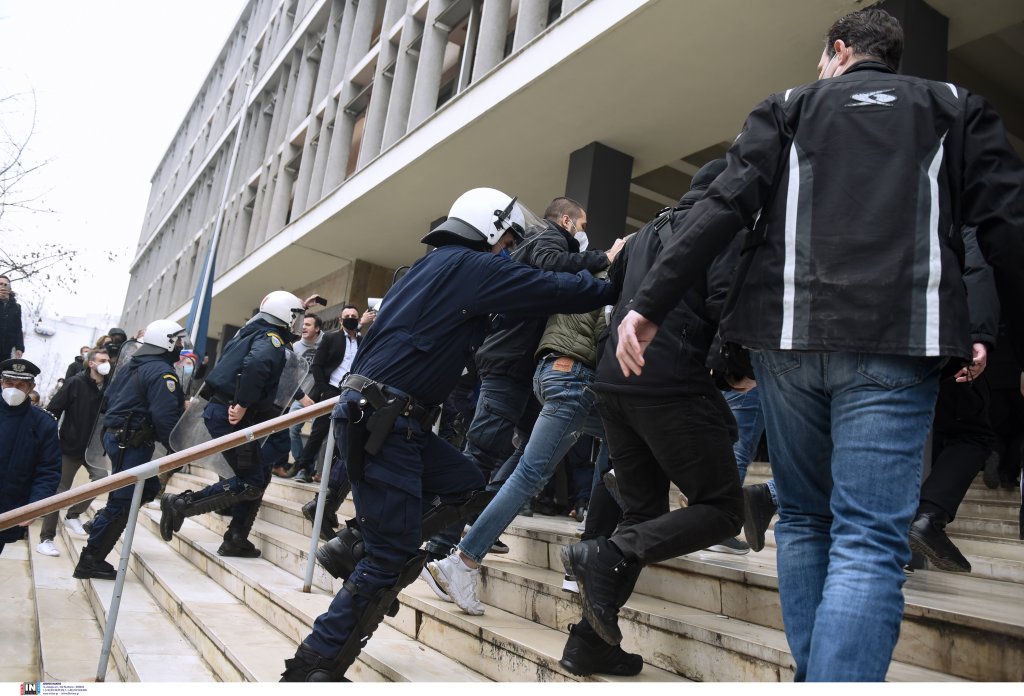 Κατά την είσοδο των εμπλεκομένων, κάποιοι από τους συγκεντρωμένους εκτόξευσαν καφέδες, ενώ φώναζαν «δολοφόνοι, καθάρματα» και κινήθηκαν προς το μέρος τους, αλλά παρεμποδίστηκαν από αστυνομικούς, σύμφωνα με την τοπική ιστοσελίδα grtimes.gr. Ίδιο σκηνικό επικράτησε και κατά την έξοδό τους.