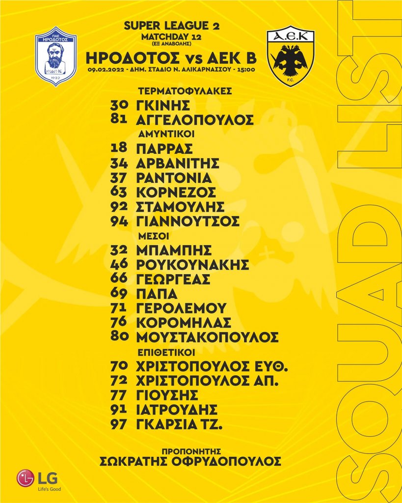 Οι 20 ποδοσφαιριστές που επέλεξε ο προπονητής της ΑΕΚ Β Σωκράτης Οφρυδόπουλος για τον αυριανό εξ αναβολής αγώνα με τον Ηρόδοτο στο Ηράκλειο, για τη 12η αγωνιστική της Super League 2.