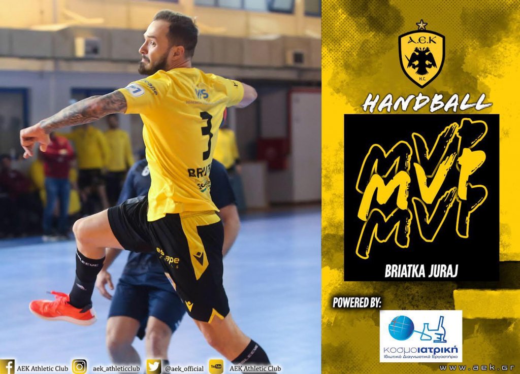 Ο Γιουράι Μπριάτκα αναδείχθηκε κορυφαίος παίκτης «Κοσμοϊατρική Διαγνωστικό Εργαστήριο» της αναμέτρησης με την Πυλαία για την 4η αγωνιστική της Β΄φάσης του Πρωταθλήματος της Handball Premier. Ο Σλοβάκος εξτρέμ της ΑΕΚ πέτυχε σημαντικά γκολ και είχε καθοριστική σημασία στη δύσκολη νίκη που πήρε η ομάδα του Δημήτρη Δημητρούλια στην Πυλαία.
