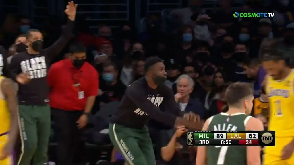 Στο τρίτο 12λεπτο, ο σέντερ των Μπακς ευστόχησε σε συνεχόμενα σουτ τριών πόντων, κόντρα στους Λέικερς, ενθουσιάζοντας τον Έλληνα φόργουορντ που βρισκόταν στον πάγκο