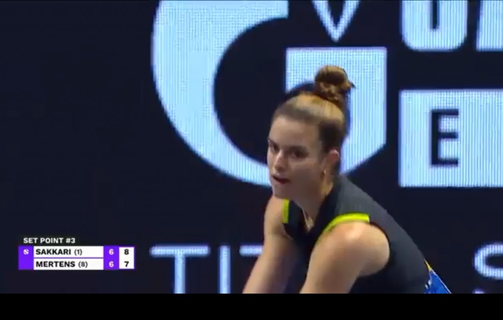 Με break ξεκίνησε η Σάκκαρη από δύο συνεχόμενα διπλά λάθη της Μέρτενς. Οι αδύναμες επιστροφές της Μέρτενς έφεραν το 2-0 για την Μαρία. Η Βελγίδα άρχισε να κάνει κι άλλα διπλά λάθη στο σερβίς της και με ένα ακόμη αβίαστο στο φόρχαντ, έδωσε δεύτερο break στην Σάκκαρη που πήρε προβάδισμα 3-0 στο σετ. Με δυσκολία έκανε το 4-0 μετά από λάθος επιστροφή της αντιπάλου της η οποία νωρίτερα είχε break point. Το 5-0 έγινε από νέο διπλό λάθος της τραγικής Βελγίδας στο δεύτερο σετ. Η Μαρία σέρβιρε για το ματς, αλλά τα λάθη της έδωσαν break στην Μέρτενς που μείωσε 5-1 και στη συνέχεια σε 5-2 στο σερβίς της.