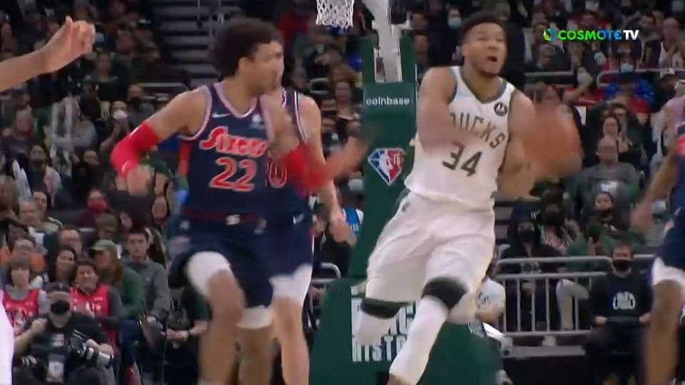 Στο τελευταίο πεντάλεπτο του ημιχρόνου, ο Αντετοκούνμπο βρήκε, εξαιρετικά, τον συμπαίκτη του και ο 27χρονος σέντερ άφησε την μπάλα στο καλάθι των Σίξερς