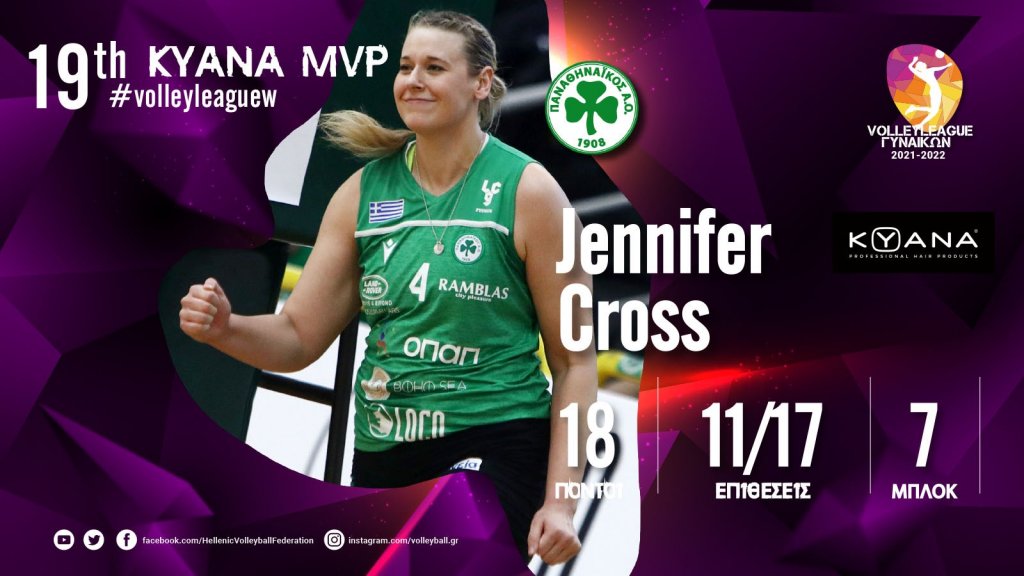 Είναι το δεύτερο βραβείο KYANA MVP για τη Τζένιφερ Κρος τη σεζόν 2021-22 και τρίτη συνολικά για αθλήτρια του Παναθηναϊκού. Η πρώτη ήταν την 13η αγωνιστική και στο ντέρμπι με τον ΠΑΟΚ.