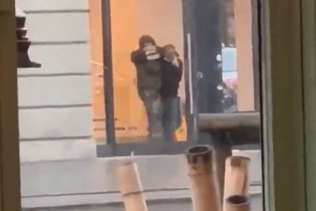 Σε εικόνες που αναρτήθηκαν στα social media φαίνεται ένας ένοπλος άνδρας να κρατάει ένα άτομο πίσω από ένα παράθυρο και να το απειλεί με το όπλο (κεντρική φωτο).