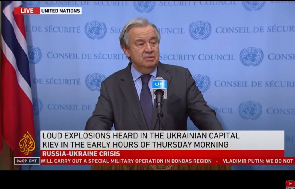 Ο Γενικός Γραμματέας του Οργανισμού Ηνωμένων Εθνών (ΟΗΕ), ο Αντόνιο Γκουτέρες, απηύθυνε έκκληση στον πρόεδρο της Ρωσίας να σταματήσει τον πόλεμο στην Ουκρανία «εν ονόματι της ανθρωπότητας», λίγη ώρα μετά την ανακοίνωση του Βλαντιμίρ Πούτιν ότι διέταξε να διεξαχθεί στρατιωτική επιχείρηση.