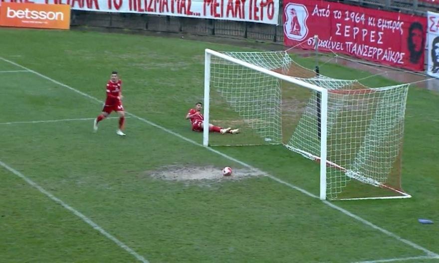 Απίθανη φάση στο Πανσερραϊκός - ΑΕΛ: Η λάσπη σταμάτησε την μπάλα πάνω στη γραμμή (VIDEO)