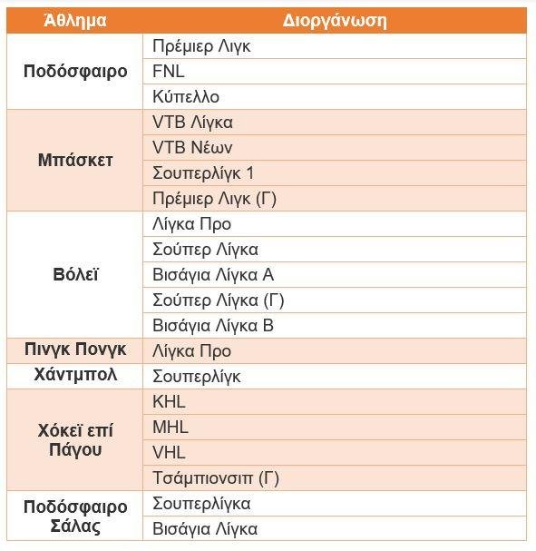 Συγκεκριμένα, οι αγώνες των παρακάτω ρωσικών διοργανώσεων δεν θα διατίθενται προς στοιχηματισμό είτε μέσω του Pamestoixima.gr, είτε μέσω του δικτύου των Καταστημάτων ΟΠΑΠ.