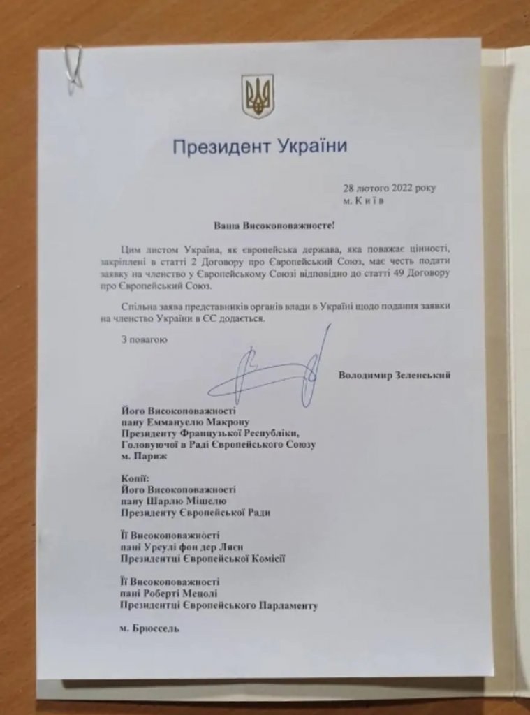 Με την παρούσα επιστολή, η Ουκρανία, ως ευρωπαϊκό κράτος που σέβεται τις αξίες που κατοχυρώνονται στο άρθρο 2 της Συνθήκης για την Ευρωπαϊκή Ένωση, έχει την τιμή να υποβάλει αίτηση για ένταξη στην Ευρωπαϊκή Ένωση σύμφωνα με το άρθρο 49 της Συνθήκης για την Ευρωπαϊκή Ένωση.