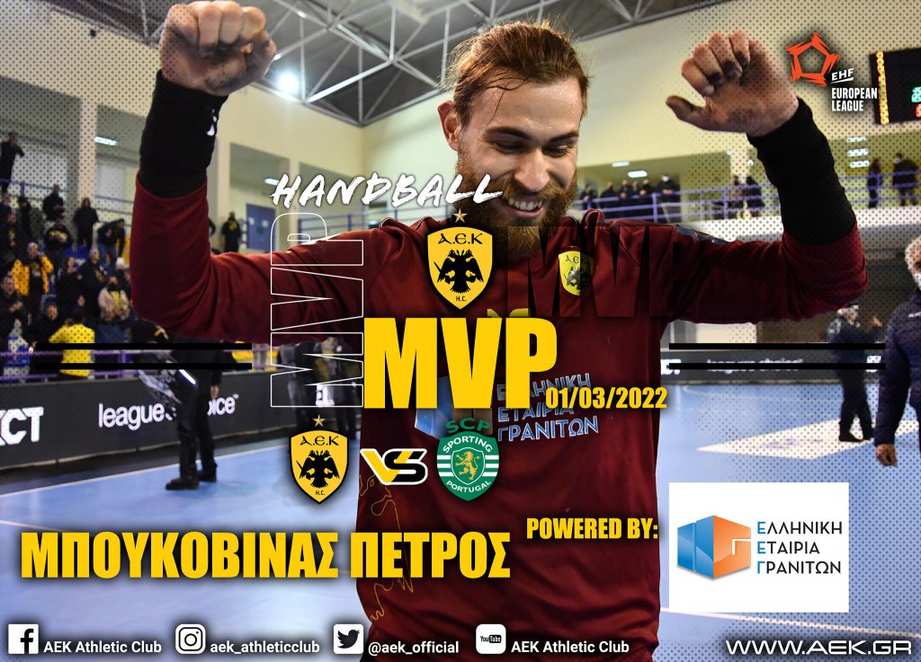 Ο Πέτρος Μπουκοβίνας αναδείχθηκε «Ελληνική Εταιρία Γρανιτών Α.Β.Ε.Ε.» MVP της αναμέτρησης με την Σπόρτινγκ. Ο τερματοφύλακας της ΑΕΚ είχε εξαιρετική παρουσία και καλά ποσοστά αποκρούσεων κάτω από τα δοκάρια και ήταν καθοριστικός παράγοντας στη νίκη της Ένωσης επί της ομάδας της Λισαβόνας με 25-24.