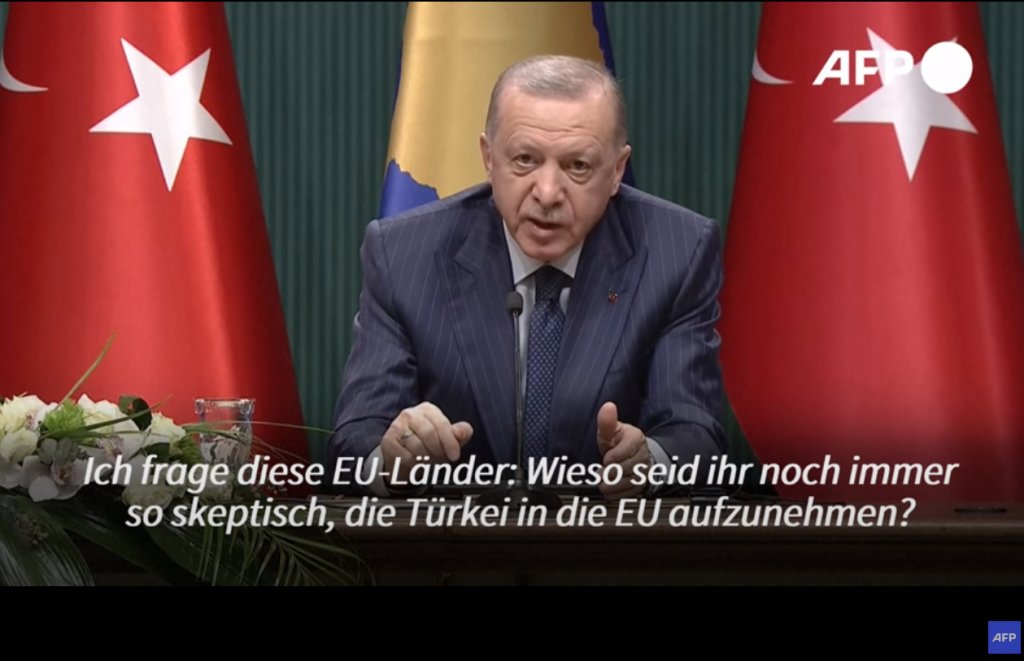 Ο Ερντογάν διαμαρτυρήθηκε διότι όπως είπε η Τουρκία περιμένει σχεδόν από τη δεκαετία του ’60 να ενταχθεί στην ΕΕ και διερωτήθηκε αν πρέπει να γίνει πόλεμος και στη δική του χώρα για να δείξουν ευαισθησία οι Βρυξέλλες: «Λέω στις χώρες – μέλη της ΕΕ, πως την ευαισθησία που τώρα δείχνετε στην Ουκρανία, να τη δείξετε και για την Τουρκία. Μήπως μόνο όταν κάποιος κηρύξει τον πόλεμο στην Τουρκία και της επιτεθεί τότε θα βάλετε στην ατζέντα σας την Τουρκία;».