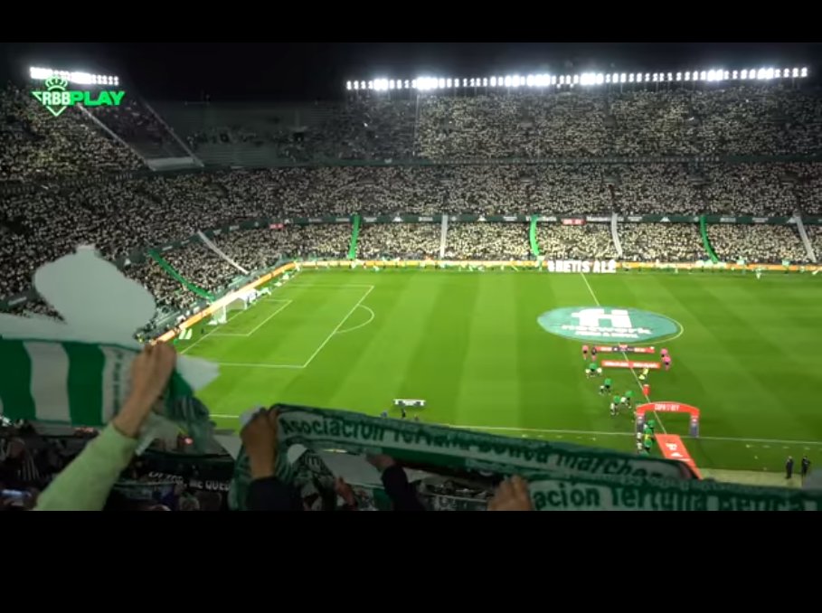Οπαδοί της Μπέτις, όλοι όρθιοι, κρατώντας κασκόλ, τραγούδησαν τον ύμνο της αγαπημένης τους ομάδας, προκαλώντας ανατριχίλα σε όποιον παρακολουθούσε αυτή τη σπουδαία στιγμή.
