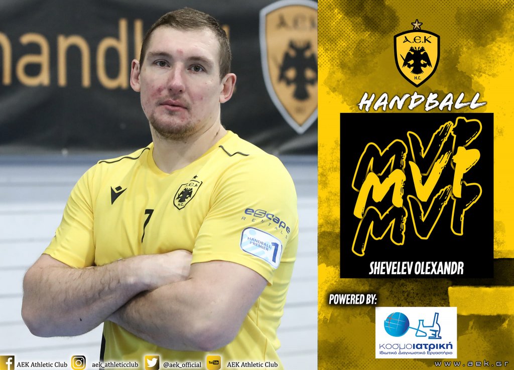 Ο Ολεξάντρ Σέβελεφ πήρε αρκετό χρόνο συμμετοχής στο παιχνίδι της ομάδας χάντμπολ της ΑΕΚ με τον Αερωπό για την 6η αγωνιστική της Β' φάσης του Πρωταθλήματος της Handball Premier και έδειξε εξαιρετικά στοιχεία. Μάλιστα, ο 34χρονος διεθνής Ουκρανός πίβοτ της Ένωσης βρήκε δίχτυα 3 φορές και ήταν αυτός που αναδείχθηκε «Κοσμοϊατρική Διαγνωστικό Εργαστήριο» MVP.