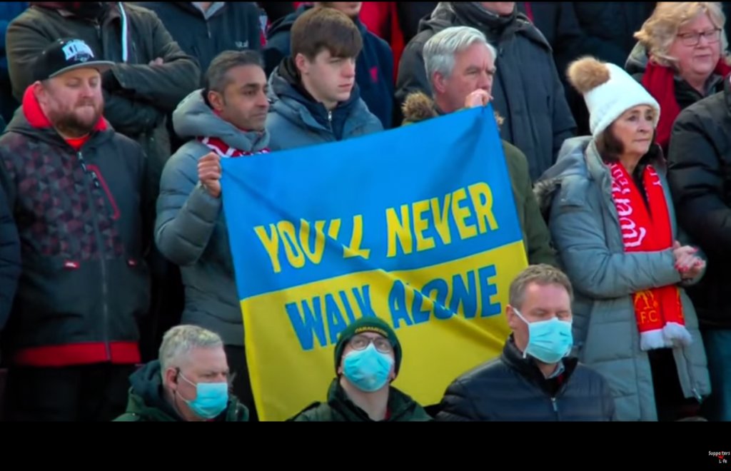 Αυτός περιελάμβανε το τραγούδι με το οποίο έχει ταυτιστούν οι φίλοι της Λίβερπουλ, που τραγούδησαν το "You'll never walk alone", αυτή τη φορά απευθυνόμενοι στους Ουκρανούς, που δίνουν μάχη να προστατέψουν τα εδάφη τους απέναντι στον Ρώσο εισβολέα.