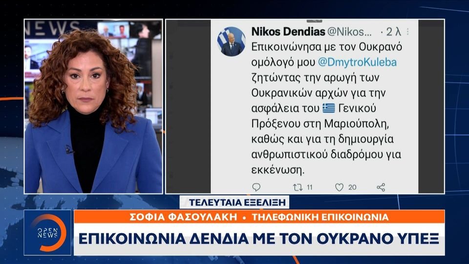 Σύμφωνα με ανάρτηση του υπουργείου Εξωτερικών στο Twitter o κ. Δένδιας ζήτησε «την αρωγή των Ουκρανικών αρχών για την ασφάλεια του Έλληνα Γενικού Πρόξενου στη Μαριούπολη, καθώς και για τη δημιουργία ανθρωπιστικού διαδρόμου για εκκένωση».