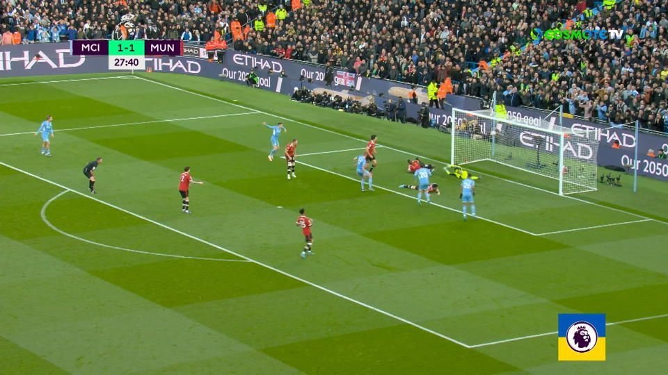 Ο Άγγλοςμπήκε στη μεγάλη περιοχή, νικήθηκε από τον Ντε Χέα, η άμυνα της Γιουνάιτεντ δεν έδιωξε και ο Ντε Μπρόινε, στο 28' έδωσε, ξανά, προβάδισμα στους πρωταθλητές Αγγλίας