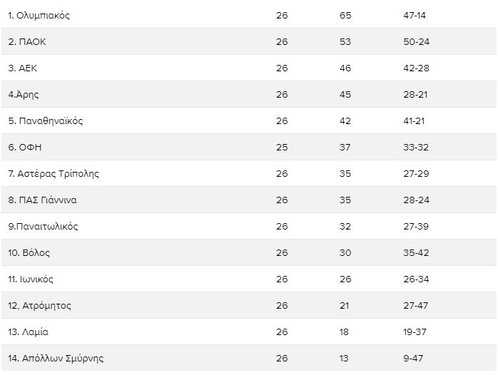 Στην τελευταία αγωνιστική της κανονικής περιόδου, το αήττητο του Ολυμπιακού στο πρωτάθλημα έλαβε τέλος. Ο Άρης επικράτησε με 2-1 στο «Κλεάνθης Βικελίδης» και έγινε η πρώτη ομάδα που κερδίζει φέτος στο πρωτάθλημα τους «ερυθρόλευκους» που ολοκλήρωσαν την κανονική διάρκεια στο +12 από τον δεύτερο ΠΑΟΚ, που πέρασε νικηφόρα από την Λαμία.