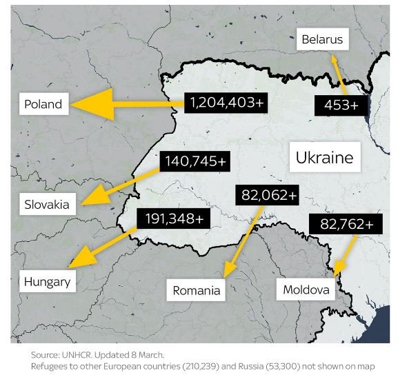 Δείτε στην galleryτον χάρτη του Sky News με τις χώρες στις οποίες κατευθύνθηκαν οι πρόσφυγες από την Ουκρανία. Δεν περιλαμβάνονται οι πρόσφυγες που μετακινήθηκαν σε χώρες εκτός ΕΕ (210.000) και στη Ρωσία (53.300).
