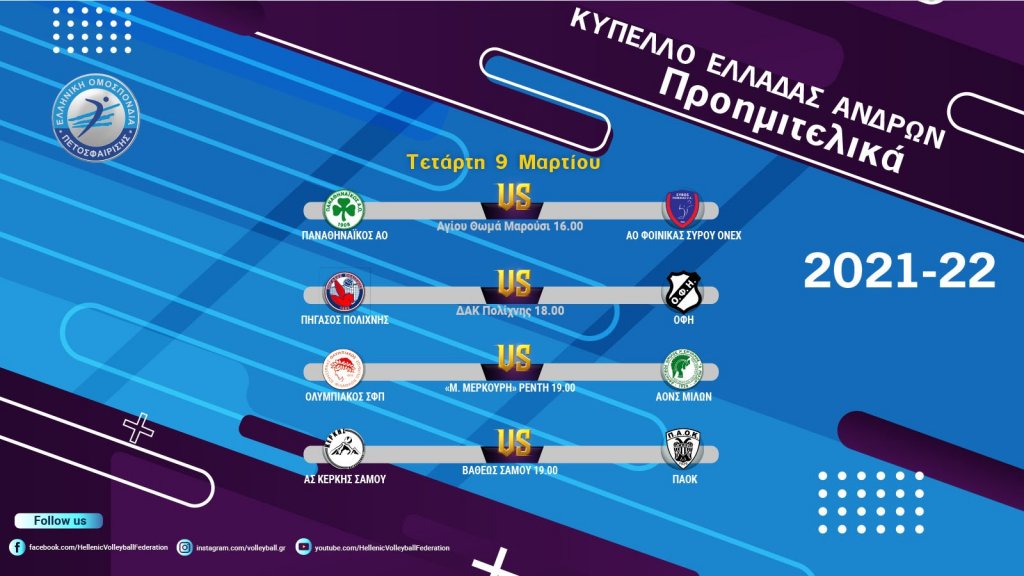 Στις 18:00 ο πρωτοπόρος της Pre League Πήγασος Πολίχνης (που στον προηγούμενο γύρο απέκλεισε την Κηφισιά) υποδέχεται στη Θεσσαλονίκη τον ΟΦΗ με τις δύο ομάδες να διεκδικούν για πρώτη φορά στην ιστορία τους την πρόκριση τους σε Final-4 Κυπέλλου.