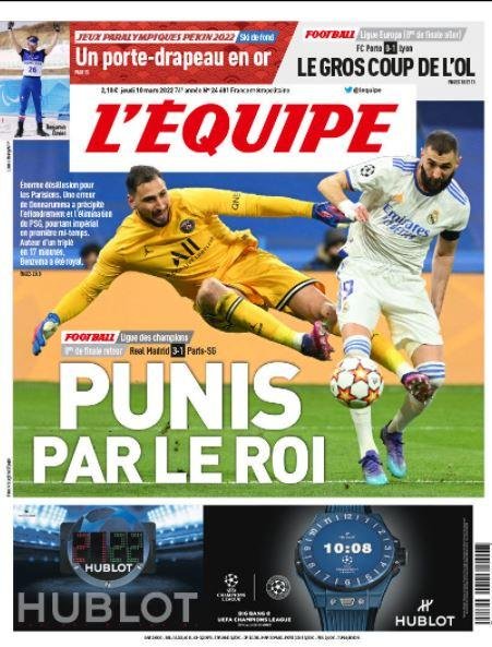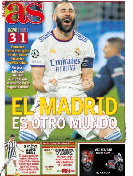 Η ανατροπή της Ρεάλ Μαδρίτης στο "Σαντιάγκο Μπερναμπέου", με χατ τρικ του Καρίμ Μπενζεμά, και η πρόκριση στα προημιτελικά του Τσάμπιονς Λιγκ, με το 3-1 επί της Παρί Σεν Ζερμέν, κυριαρχεί στον διεθνή Τύπο.
