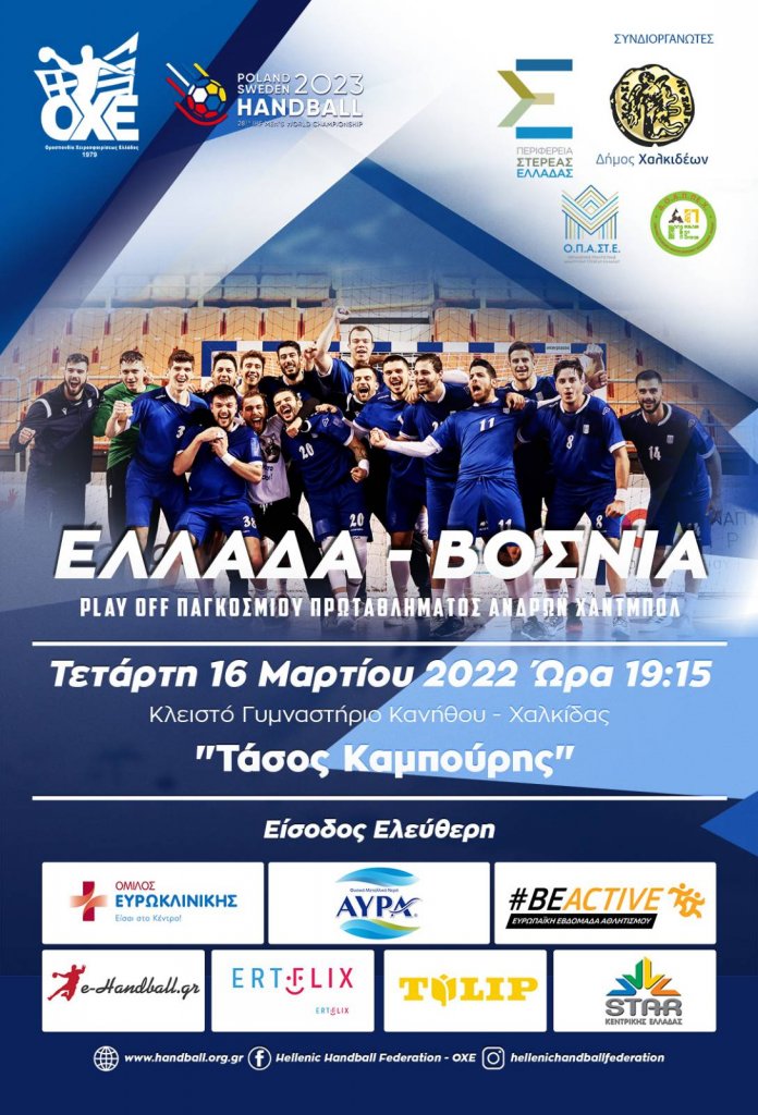Το αντιπροσωπευτικό μας συγκρότημα θα υποδεχθεί τους Βόσνιους στη Χαλκίδα την Τετάρτη 16 Μαρτίου 2022 και ώρα 19:15, ενώ ο επαναληπτικός θα διεξαχθεί το Σάββατο 19 Μαρτίου 2022 και ώρα 21:00 στην πόλη Τούζλα.