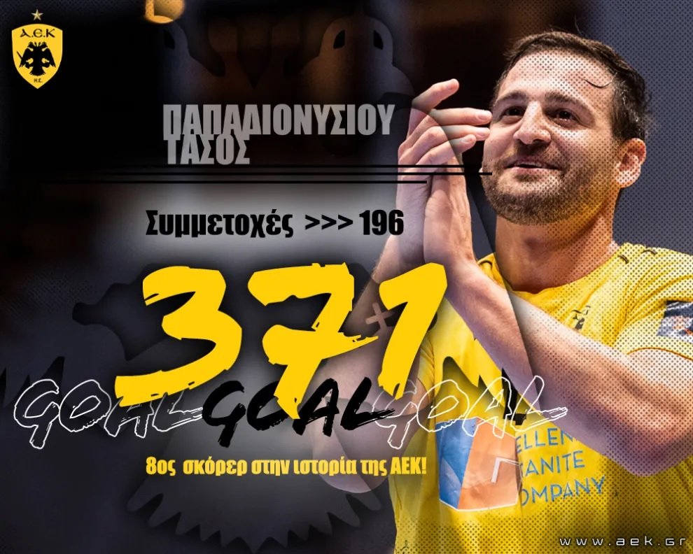 Όσον αφορά τους χειροσφαιριστές μας, ο Τάσος Παπαδιονυσίου με τα 2 γκολ που σημείωσε έφτασε τα 371 τέρματα με τη φανέλα της ΑΕΚ και «έπιασε» τον Αλέξη Αλβανό στην 8η θέση της λίστας των all time scorers! Πρόκειται για ένα πολύ μεγάλο επίτευγμα, από τον πίβοτ του «Δικεφάλου», που μετρά πλέον 196 αγώνες και 371 γκολ.