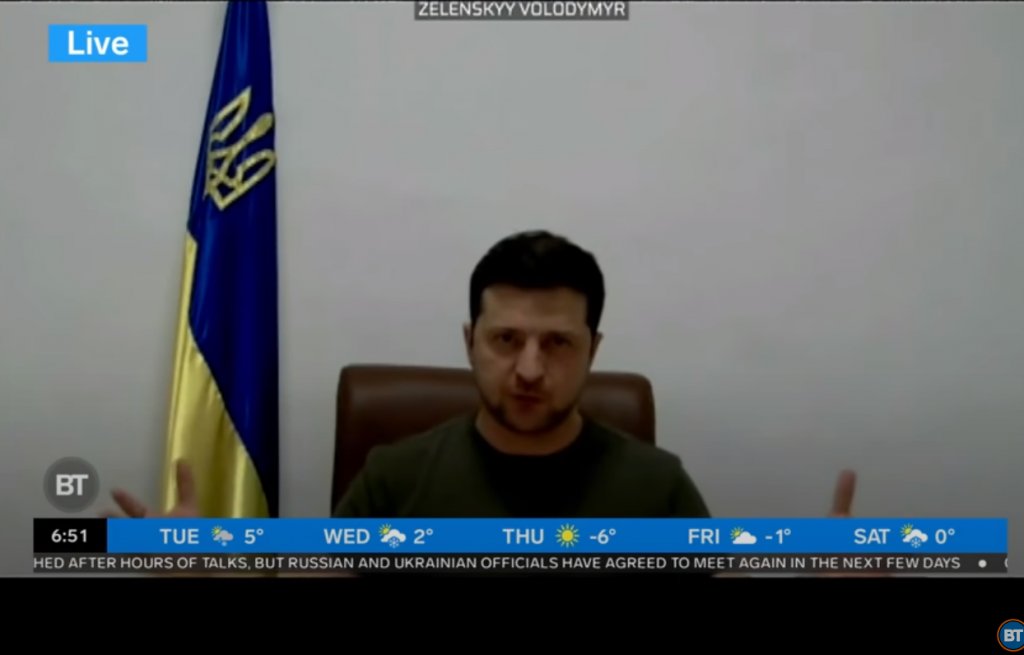 «Καλώ όλους τους φίλους της Ουκρανίας να επισκεφθούν το Κίεβο. Εδώ μπορεί να είναι επικίνδυνο. Γιατί ο ουρανός μας δεν έχει κλείσει ακόμα για ρωσικούς πυραύλους και αεροπλάνα. Η απόφαση να ενισχύσουμε το οπλοστάσιό μας στον αέρα δεν έχει ληφθεί ακόμη. Δεν έχουμε παραλάβει αεροπλάνα. Αλλά... Ξέρετε σίγουρα ότι τα μάτια όλων των ανθρώπων του κόσμου είναι πλέον στραμμένα στην πρωτεύουσά μας, στους Ουκρανούς. Έτσι, όλοι όσοι είναι μαζί μας θα λάβουν ευγνωμοσύνη. Όχι μόνο των δικών μας, αλλά και άλλων εθνών του κόσμου», δήλωσε χαρακτηριστικά ο Ζελένσκι.
