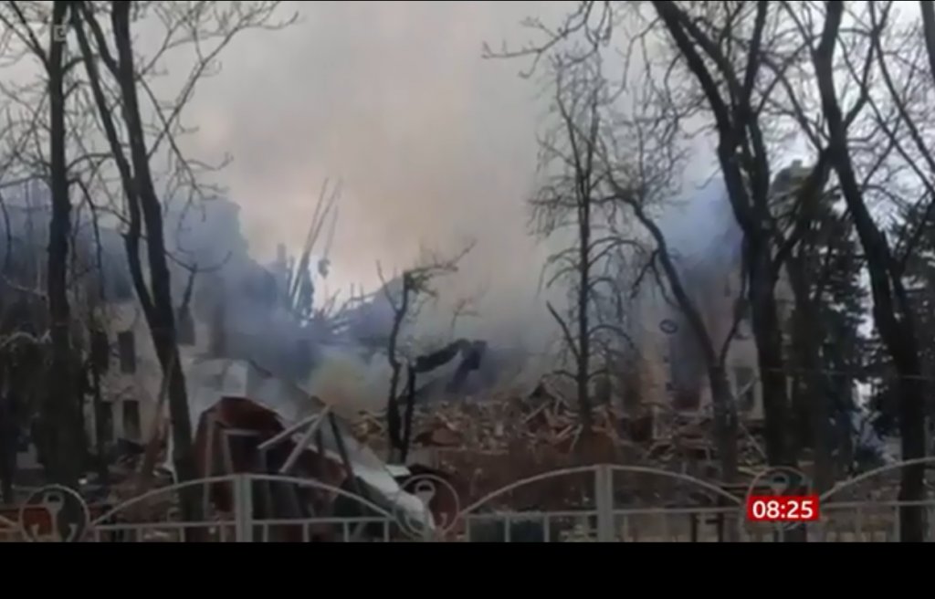 Ο δήμος της Μαριούπολης δημοσιοποίησε από τη δική του πλευρά στην πλατφόρμα Telegram φωτογραφία που δείχνει το κεντρικό τμήμα του θεάτρου εντελώς κατεστραμμένο, με μια λευκή στήλη καπνού να υψώνεται από τα συντρίμμια.
