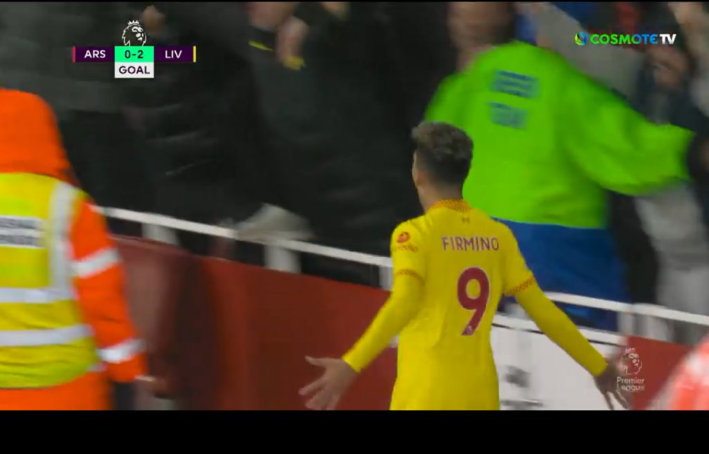 Ο Φιρμίνο πήδηξε τις διαφημιστικές πινακίδες και έτρεξε να πανηγυρίσει με τους οπαδούς της Λίβερπουλ που ταξίδεψαν μέχρι το Λονδίνο, πέφτοντας στην αγκαλιά τους.
