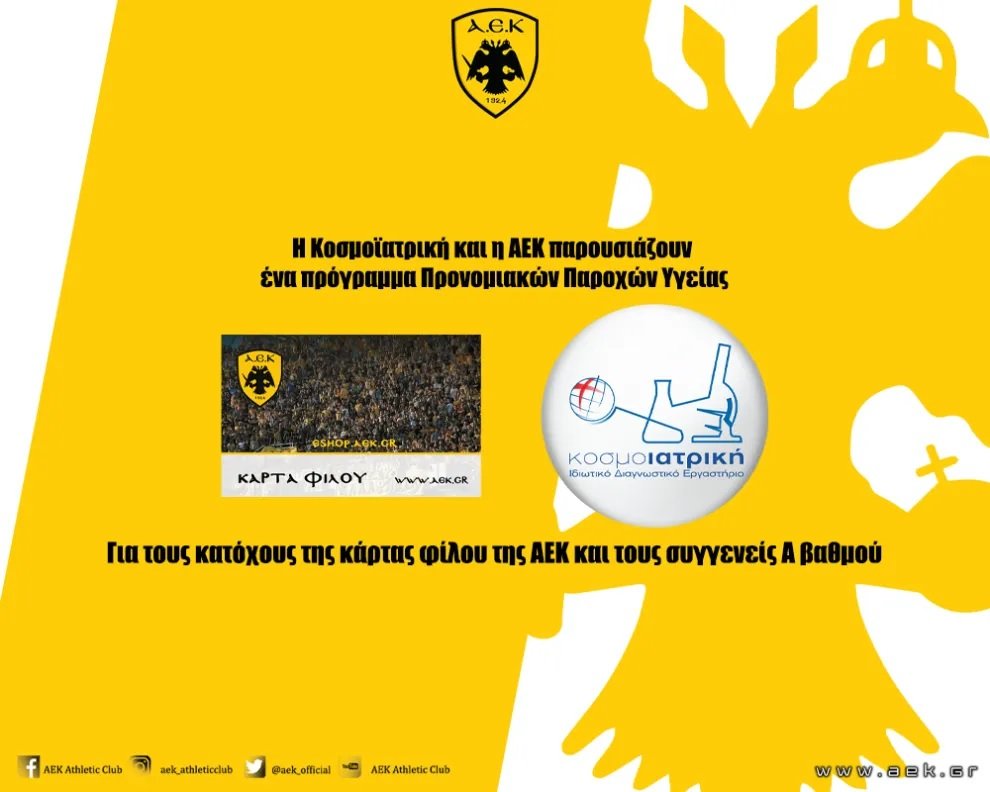 Η Κοσμοϊατρική και η ΑΕΚ παρουσιάζουν ένα πρόγραμμα Προνομιακών Παροχών Υγείας για τους κατόχους της κάρτας φίλου της ΑΕΚ και τους συγγενείς Α βαθμού, τους αθλητές, το προσωπικό και τους συγγενείς Α βαθμού. Το πρόγραμμα αποσκοπεί στην παροχή αξιόπιστων υπηρεσιών υγείας και πρόληψης, με γνώμονα την καλύτερη υγεία και ευεξία των ασφαλισμένων.
