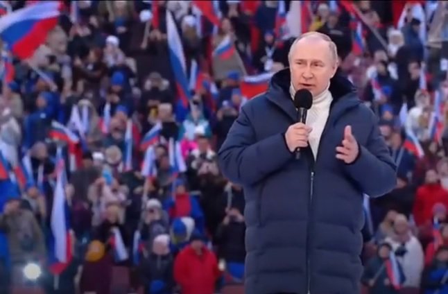 «Διαπράχθηκε γενοκτονία στο Ντονμπάς. Στόχος της επιχείρησης στην Ουκρανία είναι να απαλλαχθούμε από αυτή την κατάσταση» είπε στην ομιλία του ο Πούτιν, στη διάρκεια συναυλίας, ενώ σημείωσε για άλλη μια φορά πως οι πολίτες της Κριμαίας έκαναν τη σωστή επιλογή το 2014, καθώς «ήθελαν να ζήσουν στη δική τους, ιστορική γη, τη Ρωσική Ομοσπονδία».