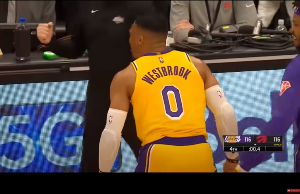 Με το σκορ στο 116-113, υπέρ των Ράπτορς, οι Λέικερς έκαναν φάουλ, για να σταματήσουν το χρονόμετρο. Οι γηπεδούχοι δεν είχαν δικαίωμα βολών με 10.6 δευτερόλεπτα να απομένουν, αλλά μετά την επαναφορά ο Γουέστμπρουκ έκλεψε την μπάλα από τον Σκότι Μπαρνς που πήρε μία κακή πάσα από τον Πρέσιους Ατσιούα, στο ένα και μοναδικό κλέψιμο του 33χρονου γκαρντ στο παιχνίδι! Ο Γουέστμπρουκ κατέβηκε γρήγορα το γήπεδο με τον Μπαρνς μπροστά του, πάτησε τη γραμμή των 7.25 μέτρων, διόρθωσε όμως τη θέση του με μία μικρή κίνηση προς τα πίσω και με τρίποντο ισοφάρισε το παιχνίδι σχεδόν στην εκπνοή, στα 0.4 δευτερόλεπτα.