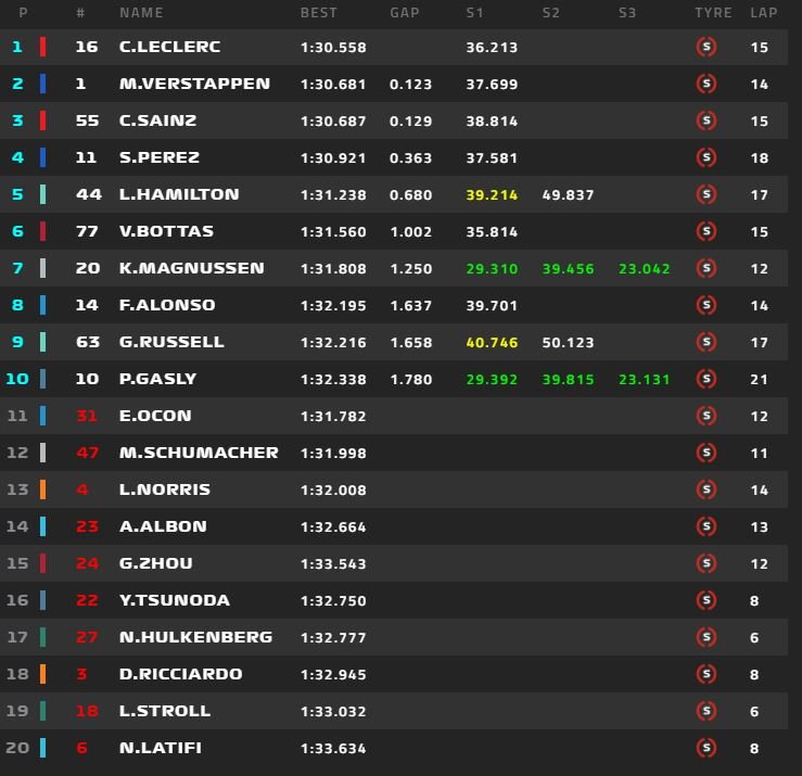 Οι Mercedes άνοιξαν το χορό, με τις Ferrari να ακολουθούν και τις Red Bull να βγαίνουν από τα γκαράζ τους αμέσως μετά. Στην πρώτη γρήγορη προσπάθεια των οδηγών ο πρώτος ανήκε στις Ferrari, αλλά με τον Φερστάπεν πάρα πολύ κοντά. Ο Κάρλος Σάινθ ήταν ταχύτερος, ο Σαρλ Λεκλέρκ σταμάτησε 44 χιλιοστά πίσω τους και ο Μαξ Φερστάπεν ήταν μόλις 12 χιλιοστά πιο αργός από τον Μονεγάσκο. Αυτό θα πει μάχη κορυφής. Η έκπληξη όμως ήταν οι χρόνοι της Mercedes, με τον Χάμιλτον να είναι 1,5 δευτερόλεπτο πίσω από τον Σάινθ. Ωστόσο, τα «ασημί βέλη» είχαν χρησιμοποιημένα ελαστικά.
