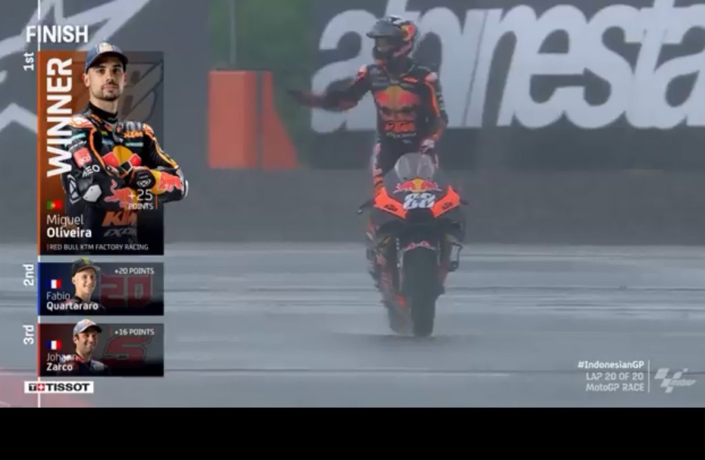 Όμως, στην βροχερή πίστα της Ινδονησίας, ο Πορτογάλος αναβάτης τερμάτισε και μάλιστα πρώτος, κατακτώντας τη τέταρτη νίκη στην καριέρα του.
