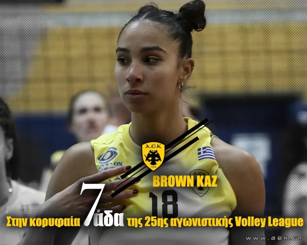 Ακόμα μία σπουδαία διάκριση για την αθλήτρια της ΑΕΚ, Καζ Μπράουν, η οποία συμπεριλήφθηκε στην κορυφαία επτάδα της 25ης αγωνιστικής της Volley League Γυναικών. H Μπράουν απέναντι στις Αμαζόνες κέρδισε 13 πόντους (8/12 επ.) και είχε 5 επιτυχημένα μπλοκ.