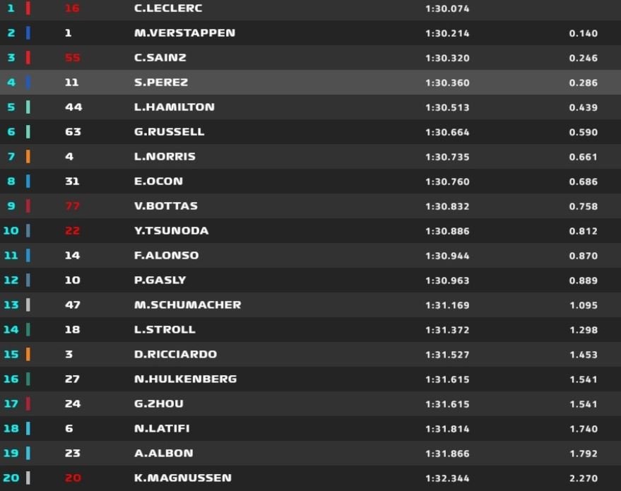 Οι δύο Ferrari ξεκίνησαν δυναμικά τη διαδικασία με τον Σαρλ Λεκλέρ να είναι στην κορυφή των χρόνων με τη μέση γόμα ελαστικών. Η Red Bull Racing θέλησε να απαντήσει λίγο αργότερα, με τον Φερστάπεν να σκαρφαλώνει εκείνος στη 2η θέση, όμως είχε λιγότερα καύσιμα. Η διαφορά των δύο ήταν σε εκείνο το σημείο στα δύο χιλιοστά.
