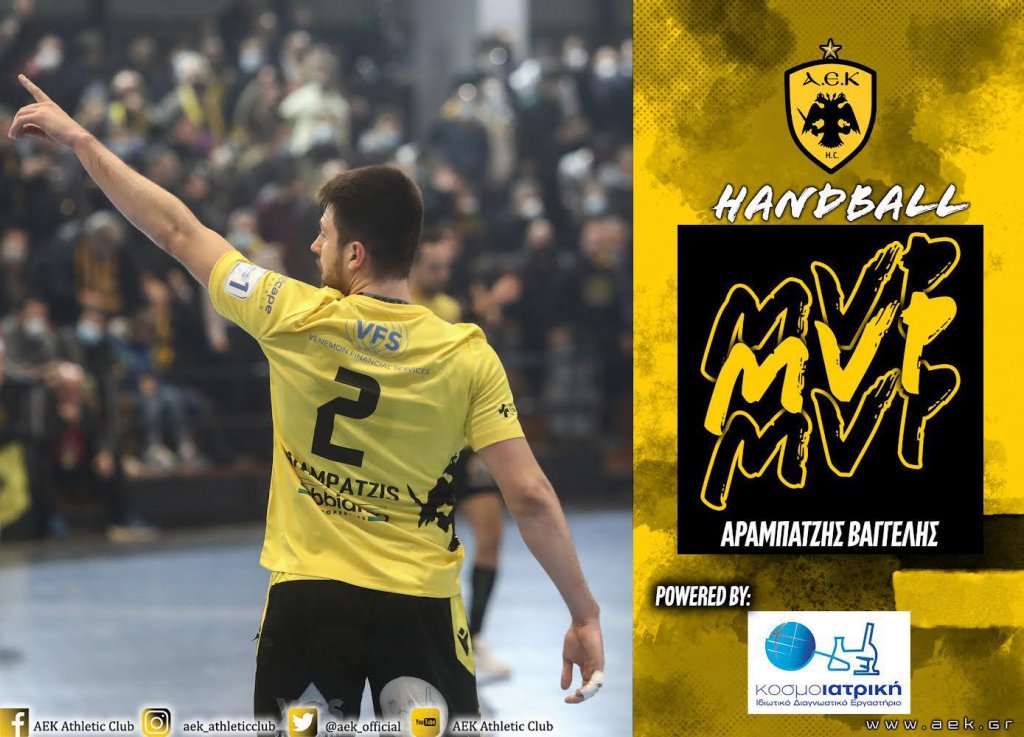Ο Βαγγέλης Αραμπατζής ήταν εξαιρετικός στο σημερινό παιχνίδι της ομάδας χάντμπολ της ΑΕΚ στη Δράμα απέναντι στην τοπική ομάδα, στο πλαίσιο της 7ης αγωνιστικής της Β' φάσης του Πρωταθλήματος της Handball Premier (23-28). Ο εξτρέμ της ΑΕΚ βρήκε δίχτυα 9 φορές και είχε καλή παρουσία σε όλη τη διάρκεια της αναμέτρησης, με αποτέλεσμα να κερδίσει τον τίτλο «Κοσμοϊατρική Διαγνωστικό Εργαστήριο» MVP.