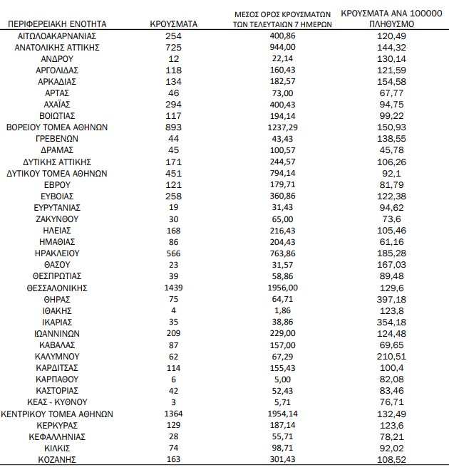 Επιπλέον, 27 περιοχές καταγράφουν τριψήφιο αριθμό κρουσμάτων.