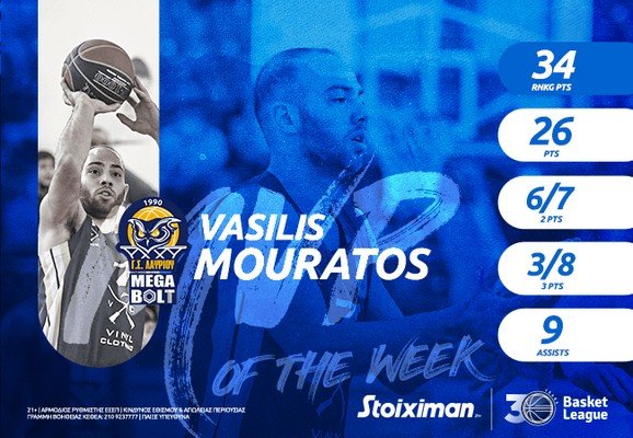 O Βασίλης Μουράτος αναδείχθηκε πολυτιμότερος παίκτης της 19ης αγωνιστική της Stoiximan Basket League.