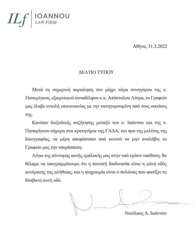 Η ανακοίνωση του δικηγορικού γραφείου του αναφέρει: “Μετά τη σημερινή παραίτηση του μέχρι τώρα συνηγόρου της κ. Πισπιρίγκου, εξαιρετικού συναδέλφου κ.κ. Απόστολου Λύτρα, το Γραφείο μας έλαβε εντολή επικοινωνίας με την κατηγορουμένη από τους οικείους της.