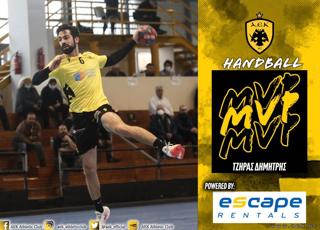 Η ομάδα χάντμπολ της ΑΕΚ πήρε μια άνετη πρόκριση στο Φάιναλ Φορ του Κυπέλλου Ελλάδας επί του Δούκα με 23-31, με τον Δημήτρη Τζηρά να είναι ασταμάτητος. Ο εξτρέμ της ΑΕΚ είχε εξαιρετική παρουσία στην αναμέτρηση για την προημιτελική φάση του Κυπέλλου απέναντι στην ομάδα των εκπαιδευτηρίων και κέρδισε τον τίτλο «Escape Car Rentals» MVP της αναμέτρησης.