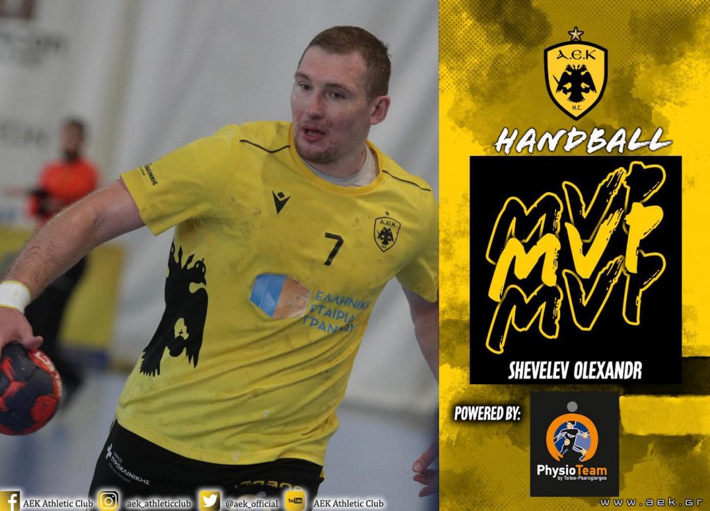 Η ομάδα χάντμπολ της ΑΕΚ διέλυσε την Πυλαία στο ΟΑΚΑ με 45-24 για την 8η και τελευταία αγωνιστική της Β' φάσης των πλέι οφ του Πρωταθλήματος της Handball Premier. Σε αυτό το ματς ο Ολεξάντερ Σέβελεφ είχε εξαιρετική παρουσία και πέτυχε 6 τέρματα, με αποτέλεσμα να αναδειχθεί «Physioteam» MVP του αγώνα.