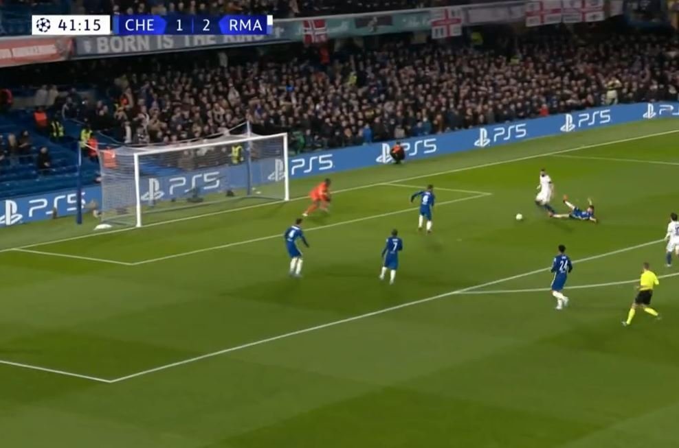 Ο Βινίσιους έκανε το γύρισμα από αριστερά, ο Ζορζίνιο προσπάθησε να διώξει αλλά έστρωσε την μπάλα στον Μπενζεμά που από κοντά πλάσαρε άστοχα