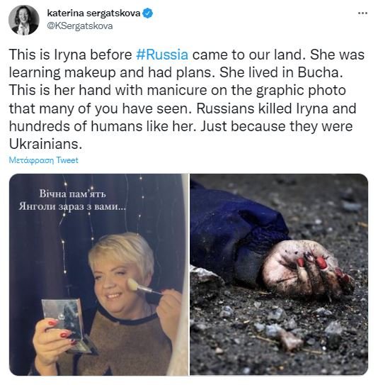 «Αυτή είναι η Ιρίνα προτού έλθει η Ρωσία στη χώρα μας. Σπούδαζε μακιγιέζ κι είχε σχέδια για τη ζωή της. Ζούσε στην Μπούκα. Αυτό είναι το χέρι της με το μανικιούρ στη φρικτή φωτογραφία που έχετε δει πολλοί. Οι Ρώσοι σκότωσαν την Ιρίνα και εκατοντάδες άλλους σαν κι αυτήν “απλώς και μόνον επειδή ήταν Ουκρανοί”», έγραψε στο Twitter.
