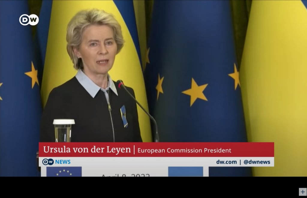 «Το ένστικτό μου λέει: Εάν αυτό δεν είναι έγκλημα πολέμου, τι είναι έγκλημα πολέμου; Αλλά είμαι γιατρός και οι δικηγόροι πρέπει να το ερευνήσουν προσεκτικά» είπε η φον ντερ Λάιεν σε δημοσιογράφους μέσα στο τρένο αναχωρώντας από την Ουκρανία.