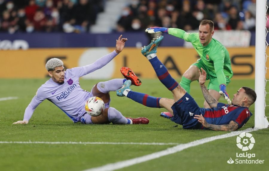 Η Μπαρτσελόνα πήρε δύσκολο διπλό στην έδρα της Λεβάντε, την οποία κέρδισε με 3-2 χάρις σε γκολ του Λουκ Ντε Γιονγκ στο τέλος. Τρία πέναλτι κέρδισε η Λεβάντε και μετέτρεψε σε γκολ τα δύο, καθώς ο Τερ Στέγκεν έπιασε το άλλο.