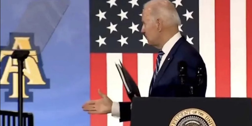Ενδεικτικά είναι τα πλάνα από την εκδήλωση της Πέμπτης που δείχνουν τον Μπάιντεν να ολοκληρώνει την ομιλία του με τη φράση «Ο Θεός να σας ευλογεί όλους», προτού γυρίσει προς τα δεξιά του και ενώ φαίνεται να λέει κάτι στο... κενό απλώνει το χέρι του για να χαιρετήσει, χωρίς να υπάρχει κανείς γύρω του.