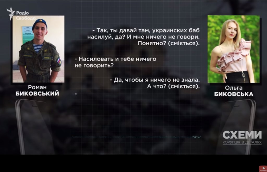 Στη συνέχεια ακούγεται μια αντρική φωνή - που πιστεύεται ότι είναι του συζύγου της, Ρομάν Μπαϊκόβσκι: «Αχά», λέει. «Έπρεπε λοιπόν να βιάσω και να μην σου πω τίποτα», της απαντάει αφού διευκρινίζει ότι η γυναίκα του δίνει την άδεια να βιάσει γυναίκες του εχθρού.