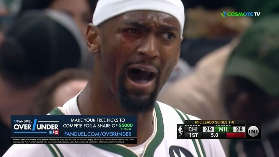 Σε διεκδίκηση του ριμπάουντ, ο Τόμπσον των Μπουλς έριξε αγκωνιά, με αποτέλεσμα ο σέντερ των Μπακς να ματώσει